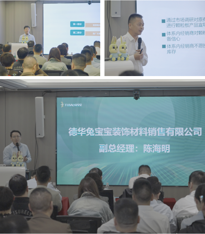 兔宝宝西南销售公司总经理朱利斌、华北销售公司总经理沈锡春、销售公司副总经理陈海明,分别对各自区域及全国推广做出成果分享及战略部署。