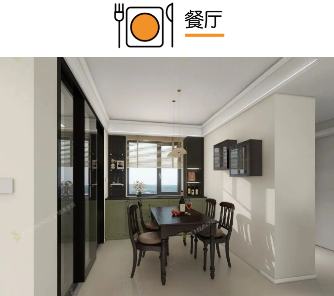 客餐厅一体,同一空间中,多种色调结合,形成自然的功能分区,层次鲜明,又各自独立浑然一体,营造出一个复古独特的就餐氛围,一深一浅的色彩基调让整个空间更加有层次感,沉稳,朴实。