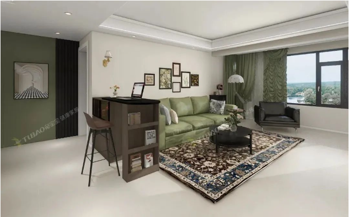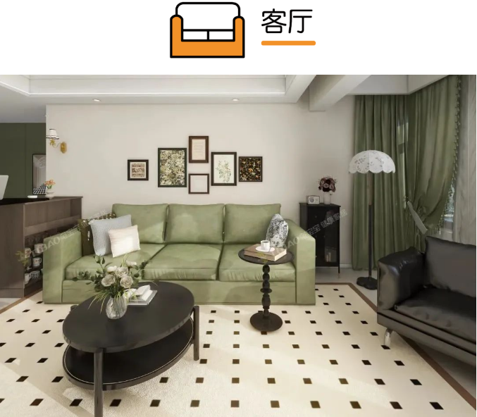 客厅整体以奶白色为主,走进休闲区,采用复古的墨绿色与原木色进行撞色搭配,加强不同功能区的交互,墨绿、奶白、深咖在此交融,呈现出一个精致复古的温馨空间。