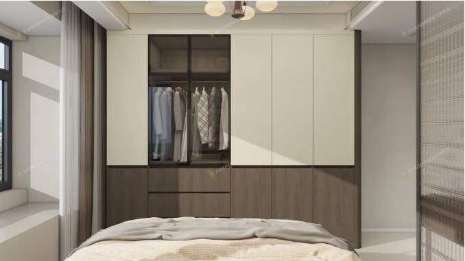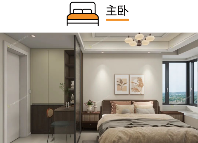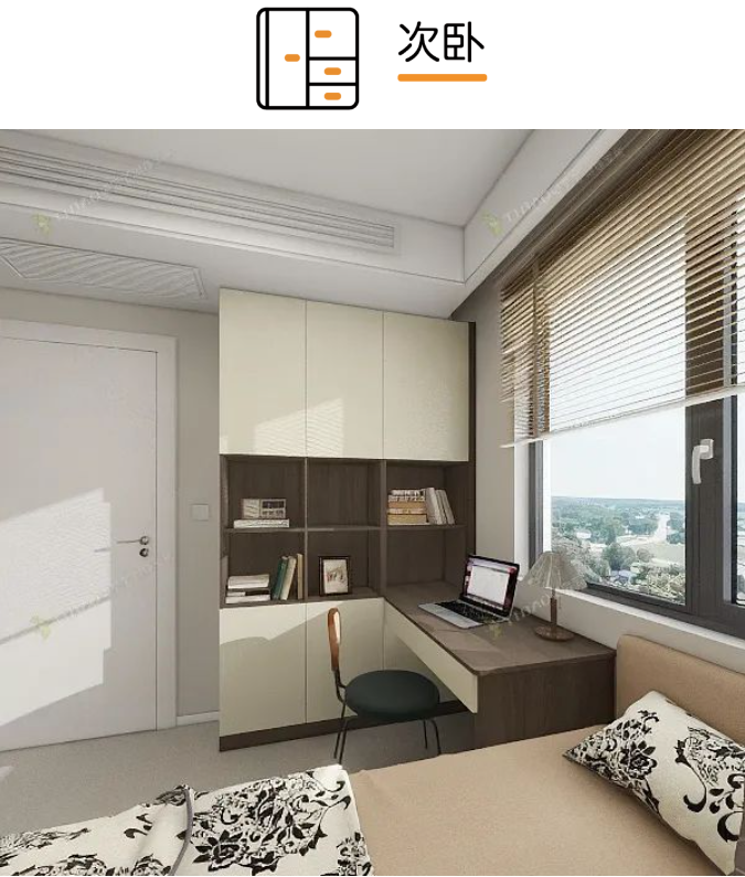 利用书桌、衣柜、床打造“实用黄金三角”,节约空间、集中收纳、动线合理、实用高效,不仅可以满足工作的需求,也能当做卧室使用,功能性更强。