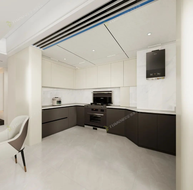 厨房的配色设计着重于营造舒适而现代的氛围,采用低调且内敛的色彩搭配。其台面布局为L型,不仅优化了空间利用,还确保了操作的便捷性。此外,吊柜和地柜的组合让厨房拥有出色的收纳功能。