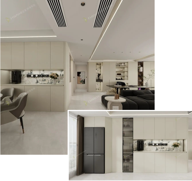餐厅更注重功能实用性,从整体到局部给人一丝不苟的印象,餐桌+餐椅,即可满足现代人的生活需求。后面一整面墙的餐边柜为餐厅背景,左侧高柜内嵌入冰箱,右侧中间的部分则是镂空造型,安装上岩板的台面与背板,还可以挂置一个管线机和可移动插座。