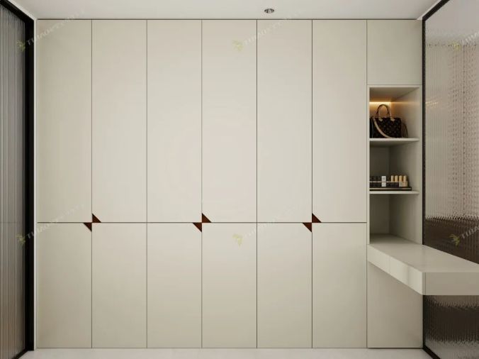 衣帽间与卧室之间巧妙地以玻璃作为分隔,既保持了空间的通透性,又实现了功能区的划分。内部配置了定制的顶天立地式大衣柜,不仅满足了大量的储物需求,而且设计有开放的格子区域,并嵌入柔和的灯带。
