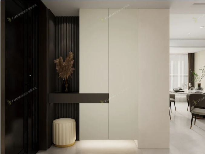 美好要从步入家门那刻开始摒弃繁复,定制一组奶白色+胡桃木色的入户柜设计,利用柜体的深度,打造换鞋凳+功能柜组合,用其灵活的分区布局为玄关增添了一抹井然有序的韵味。