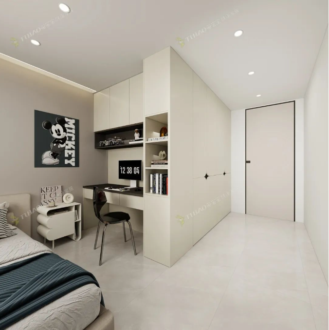 次卧将衣柜书桌二合一,充分考虑到了现代人的实际需求。衣柜部分,让衣物、包包等都能找到它们的专属位置。而书桌部分,则提供了宽敞的工作台面,搭配舒适的座椅,让你在休息、办公两不误。