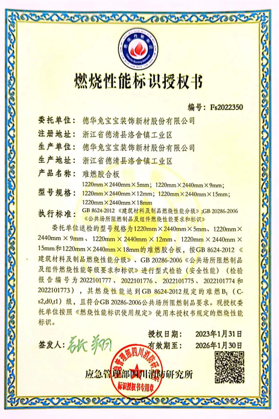 在众多阻燃木材产品中,兔宝宝难燃板凭借其卓越的阻燃性能和环保特性,成为了市场上的佼佼者。兔宝宝难燃板创新性地结合了阻燃剂浸注与胶层隔断工艺技术,充分发挥了浸渍法阻燃功效稳定及隔断法不易吸湿的优点,使难燃胶合板在不同温湿度环境下能持久保持良好的燃烧性能。而且其达到阻燃等级B1级的规范要求,600s总烟气生成量低于国家标准≤200m²,烟气毒性符合国标GB-8624-2012t1级。这意味着在火灾发生时既能有效减缓火势蔓延,还能有效抑制烟雾的产生,为消防和逃生争取更多时间。兔宝宝难燃板不仅具有优异的阻燃性能,还具有良好的环保性能,其甲醛释放限量等级可达E0级,健康环保,满足需求,家装用可以绝对放心。