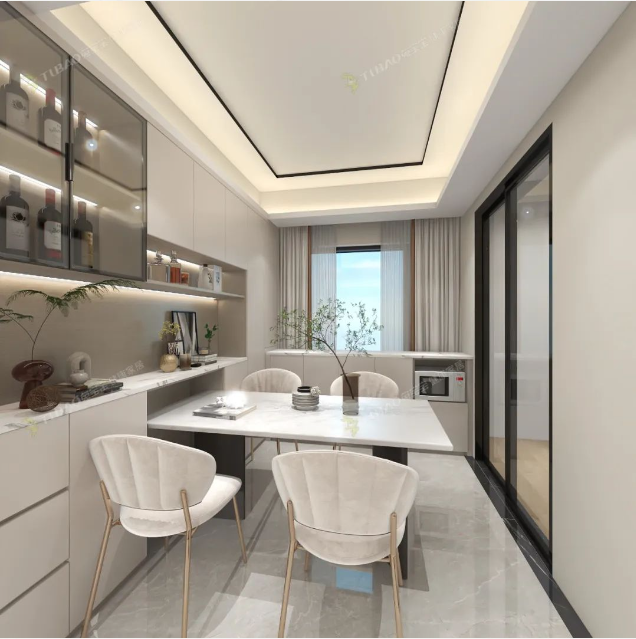 餐厅采用无主灯设计,为每一次用餐时光平添了几分浪漫而神圣的仪式感。紧邻餐桌之处,设置了一组餐边柜,其玻璃柜门低调中透露出奢华气息,内嵌式拉手设计简洁大方,整体线条流畅优美。餐边柜的中间部分特意采用镂空设计,便于摆放各类小型电器,既实用又美观。