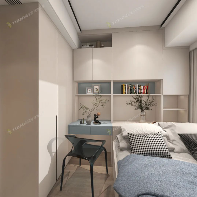 尽管这两间次卧的面积相对紧凑,但真正做到了“小而精致,功能齐全”。通过采用衣柜与书桌的巧妙一体化设计,不仅有效地满足了日常的衣物收纳需求,同时也确保了拥有一个舒适的办公空间。这种设计智慧地利用了每一寸空间,使得即便在有限的面积内,也能同时兼顾实用性与便利性,让次卧成为一个既整洁有序又充满功能性的生活区域。