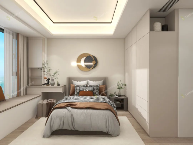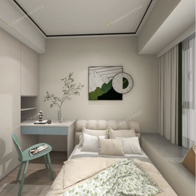 还设计了书桌与飘窗一体化结构,这一设计不仅巧妙地利用了飘窗的自然光线与视野优势,也极大地优化了空间利用效率。书桌台面宽敞舒适,完美融入飘窗区域,使得工作与休闲得以无缝衔接。