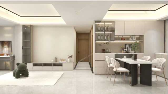 客餐厅被巧妙地安排在同一空间内,通过铺设浅灰色地毯以及摆放一字型沙发,自然地将客厅与餐厅区域进行了划分。这种一体式的布局设计,既保证了空间的明亮通透,又通过沙发背景墙上挂置的艺术画作,巧妙地丰富了空间的层次感,使整体布局更加和谐统一。