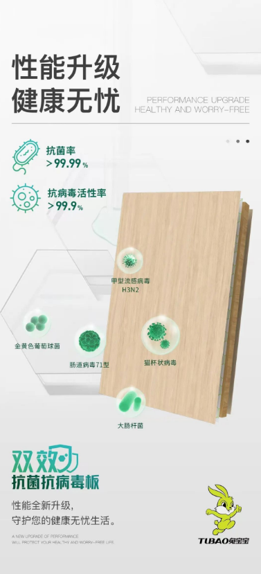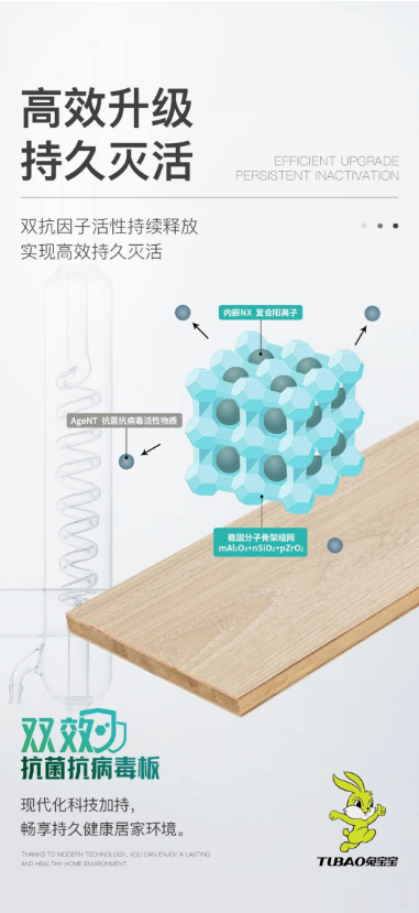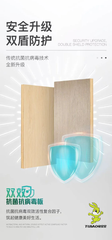 生活中的细菌、病毒,虽然微不可见,却无处不在,它悄无声息地飘散在家中的每一个角落——床头、衣柜、橱柜,时刻威胁着家人的健康。特别是在流感高发季,一旦有家庭成员不幸中招,病毒就可能通过空气流动或日常接触迅速扩散,威胁到其他家人的健康。而兔宝宝双效抗菌抗病毒板材采用了先进的表层植入技术,将双效活性复合因子牢固地附着在板材表面,这些因子如同家中的隐形卫士,24小时不间断地守护着家的每一寸空间。