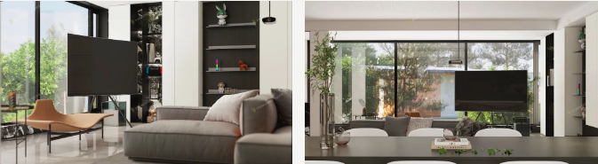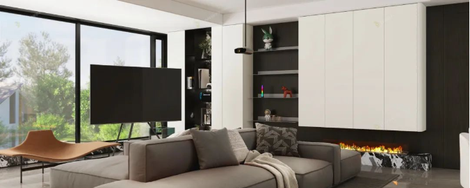 在这个充满现代感的客厅布局中,摒弃了传统的摆放模式,别出心裁地将电视机安装在灵活的支架上,这样的设计不仅便于调整观看角度,还巧妙地释放了墙面空间。而剩余的墙面和角落,则被设计成开放式与封闭式相结合的收纳柜。这些收纳柜不仅提供了充足的储物空间,让客厅保持整洁有序,其开放部分还可以作为展示架,摆放艺术品、书籍或家庭纪念品。在家具的选择上,同样注重简约与实用的结合。一款低调的沙发、一张简约风格的茶几,共同营造出一种高级的居住环境。