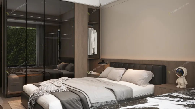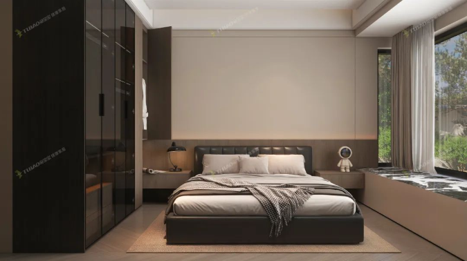 主卧以咖色作为主色调,将床头柜与衣柜融为一体,形成既实用又具设计感的整体布局。衣柜门采用透明的玻璃材质,不仅让内部衣物一目了然,更在光影交错间流露出高级质感。床头上一盏精致的台灯散发出柔和的光芒,增添了几分温馨与氛围。此外,卧室还拥有一处宽敞的飘窗,不仅拓宽了视野,更为居住者提供了一个静享悠闲时光的绝佳角落。