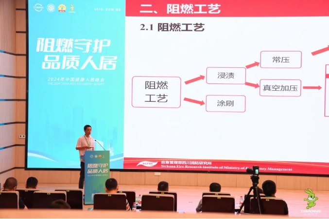 国家防火建筑材料质量检验检测中心研究员赵成刚在《阻燃人造板及制品的标准检测与技术发展》主题演讲中,对人造板阻燃处理技术和发展进行了介绍,同时也对其标准与相关测试方法进行了详细阐述,并指出采用新阻燃技术,通过标准提升,实现安全、环保和功能性的协调发展,阻燃人造板及制品的应用前景无限广阔。