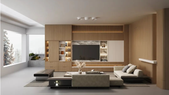 兔宝宝全屋定制雷尼尔系列,客厅以L型空间组合设计,将整体空间的护墙、木门与电视柜进行了统一的规划。电视柜采用悬空设计,并配以格栅背板,不仅使空间显得更加开阔,还增添了一份轻盈与延伸感。在细节上,电视柜通过体块的拼接与夹吊设计,层次丰富,为空间带来了更多的趣味性和视觉焦点。此外,浅色系的家具与地砖相互映衬,形成了一种和谐而统一的美感。而花瓶中点缀的绿植,则为整个空间增添了一抹清新的气息,让整个家显得更加生动而温馨。