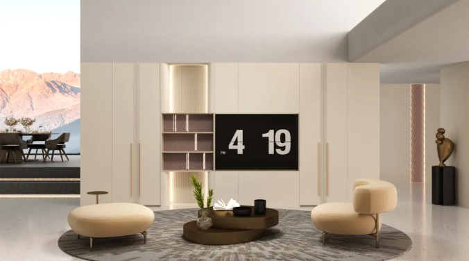 兔宝宝全屋定制黛茜系列,其电视柜设计独具匠心,采用流畅的弧线与斜边造型,不仅美观大方,还能有效防止日常磕碰。材质方面,巧妙结合了金属与玻璃的质感,特别是金色与黑色金属的搭配,形成了鲜明的色彩对比,为空间增添了强烈的视觉张力。在软装搭配上,该系列选用了风格一致的圆弧型沙发与圆形茶几,进一步强化了整体的和谐美感,让家的每一个角落都散发出低调而奢华的气息。