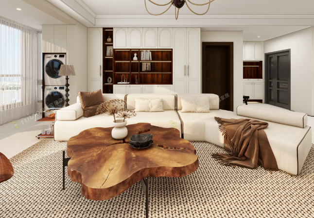 一张L型的皮质沙发成为客厅的焦点,其舒适的坐感与优雅的线条完美融合,为家人和宾客提供了惬意的休憩空间。沙发前摆放着一张木制异形茶几,营造出一种既时尚又实用的生活氛围。沙发背墙则巧妙定制了一整面书柜,采用开放格的设计,使得珍藏的书籍和艺术品得以充分展示。