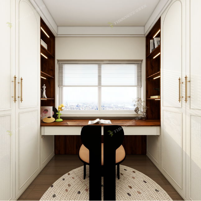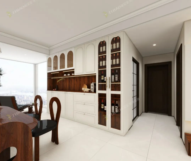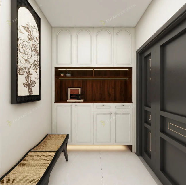 玄关柜整体奶白色搭配胡桃木色,进门给人温馨的第一印象,拱形的线条,增加了空间的层次感和浪漫感。镂空设计加上灯带,方便取物并增加照明。一侧放上艺术画和藤编的换鞋凳,不仅质感自然、舒适耐用,还以其质朴的纹理和温馨的色调,进一步强化了玄关区域的温馨与和谐感。