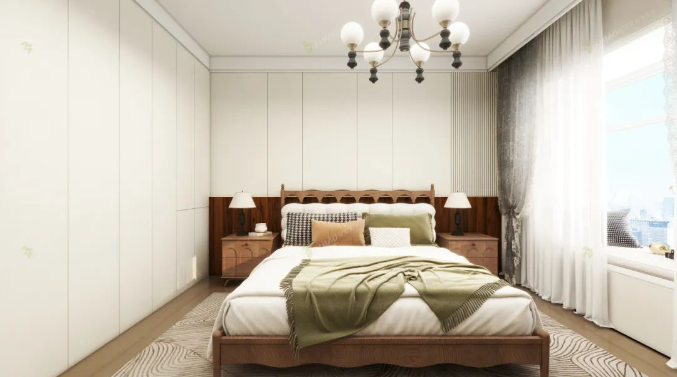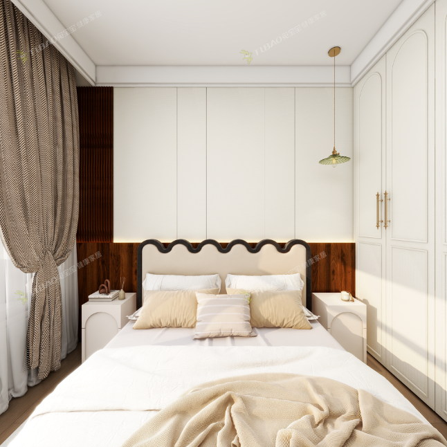 主卧采用木栅格作为背景墙,搭配下半墙的胡桃色木质装饰,营造出一种既清新又复古的独特韵味。两侧对称的台灯巧妙地点缀其间,不仅为空间增添了柔和的光线,还进一步提升了整体的格调和美感。同色系的床和床头柜相互映衬,丰富了空间的层次感,使得整个主卧区域显得更加和谐统一。