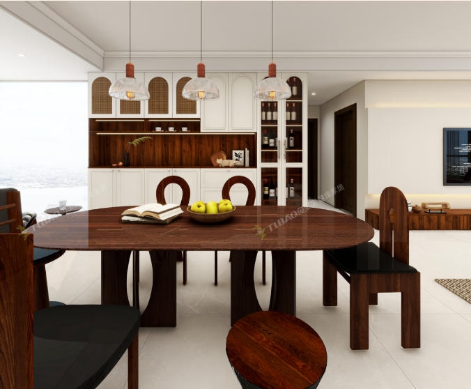 客餐厅采用了一体化设计,营造出开阔而流畅的空间感。客厅区域保留了电视机,它被简洁地悬挂在墙面上,而墙面则采用了留白处理,这种经典的黑白配色不仅彰显出高级质感,还透露出不凡的格调与品味。