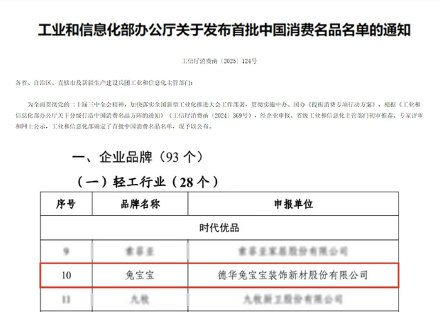 近日,工业和信息化部正式发布首批“中国消费名品”名单,涵盖轻工、纺织、食品、医药四大行业,包括企业品牌93个,区域品牌43个。兔宝宝作为家居建材行业的领军企业成功入选。