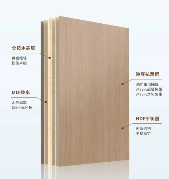 我们以全桉基材(更均衡)+MDI胶(更环保)+叠层结构(更稳定)+除醛抗菌(更健康),重新定义了基材的行业标准。