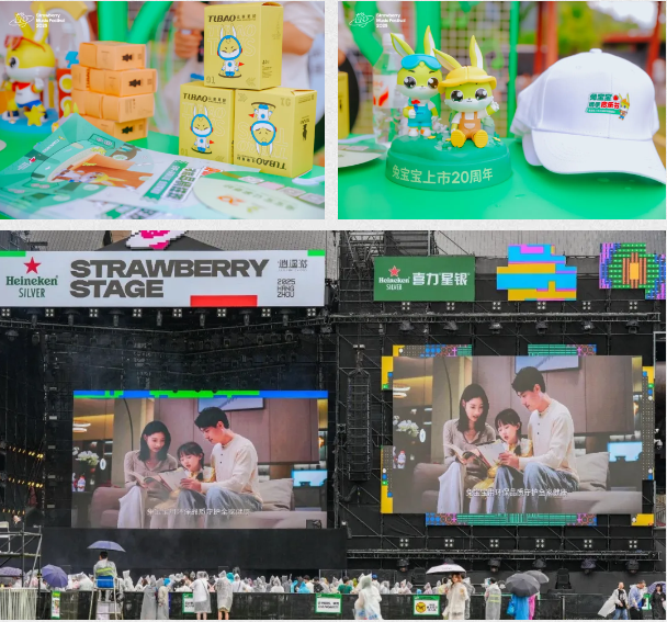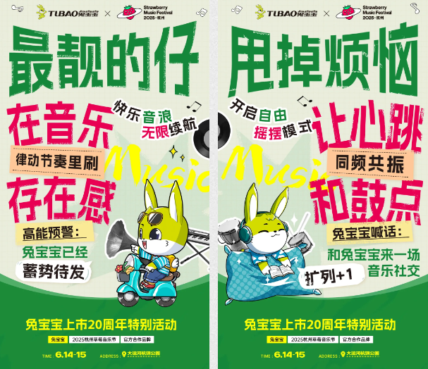 在品牌IP化浪潮中,兔宝宝不再满足于传统的终端渗透,而是以更具想象力的方式激活IP价值。通过杭州草莓音乐节,对兔宝宝IP应用进行大胆突破,巨型兔宝宝充气IP以萌趣造型强势入驻音乐节现场,成为热门拍照打卡点。乐迷们纷纷驻足,与兔宝宝IP合影留念,并分享到社交媒体,形成了自发的传播效应;限定IP周边,以高互动性、强社交属性的方式,进一步强化品牌与年轻群体的情感共鸣。同时,音乐节大屏循环播放的兔宝宝广告,以潜移默化的方式,将绿色生活理念传递给每一位年轻消费者。