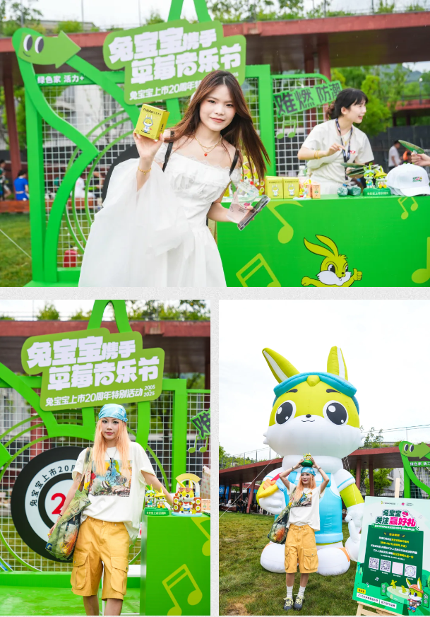 近年来,兔宝宝在营销领域持续突破创新,与Keep、网易云音乐、高德地图等平台及影视行业和亚运会、奥运会运动赛事展开多元合作。兔宝宝再次刷新了夏日营销的热度!作为上市20周年特别活动,兔宝宝以“打造绿色家,释放+活力”为主题,携手杭州草莓音乐节,将兔宝宝绿色环保的品牌理念与年轻人热爱的音乐、休闲文化完美结合。以超强的互动体验、潮酷的音乐现场和沉浸式的品牌氛围成功吸引了数万年轻人打卡参与,不仅现场人潮涌动,更在社交媒体上掀起刷屏级传播!是我们在品牌年轻化道路上的又一次创新实践。