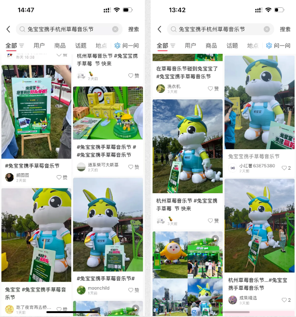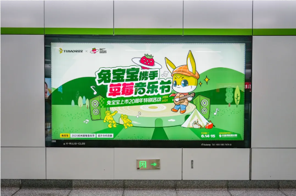 在音乐节举办期间,兔宝宝的地铁广告亮相杭州。明亮的色调、充满活力的视觉设计,将“打造绿色家,释放 + 活力”的主题完美呈现,进一步扩大了品牌的影响力。线上品牌热度也持续攀升。乐迷们在社交媒体上分享现场照片、视频和自己的感受,#兔宝宝携手杭州草莓音乐节#话题迅速登上热搜,引发了更多人对兔宝宝品牌的关注。从线上预热到线下狂欢,兔宝宝以全链路互动营销深度绑定年轻圈层,为音乐节注入独特的品牌基因,实现了品牌价值的全面跃升。