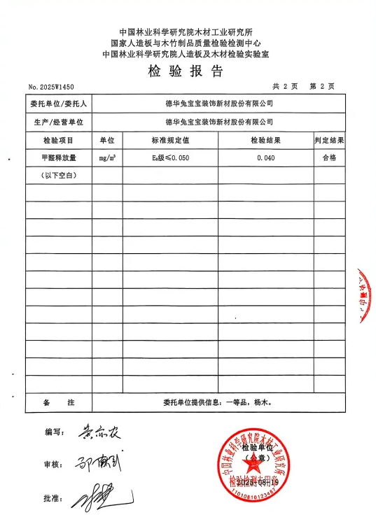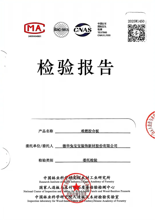 随着人们对健康生活的追求日益提升,板材的环保性成为消费者关注的另一核心焦点。本次环保检测严格依据《GB/T 39600 - 2021:甲醛释放量》国家标准,重点对兔宝宝难燃板的甲醛释放量进行检测。国家标准明确规定,甲醛释放限量≤0.050mg/m³,即为E0级。检测结果显示,甲醛释放量仅为 0.040mg/m³。充分证明了兔宝宝难燃板不仅能有效防火阻燃,还兼具绿色环保的优质品质。