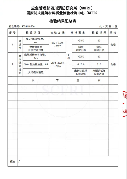 依据GB 8624 - 2012《建筑材料及制品燃烧性能分级》国家标准,对难燃板的单体燃烧性能和可燃性进行全面检测。从具体检测数据来看,兔宝宝难燃板的60s内焰尖高度为60mm,是标准值150mm的40%;燃烧增长速率指数62W/s,仅为标准值250W/s的24.8%;600s总热释放量为2.6MJ,仅为标准值15MJ的17.3%,远低于标准要求。一系列超低标准数值其实正是兔宝宝难燃板在防火性能方面高标准的体现,更是为建筑安全构筑生命防线。