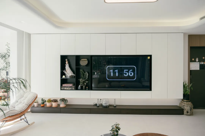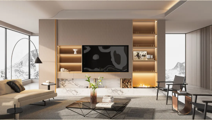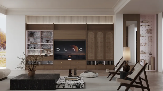 轻社交模式:社交与收纳的满分答案!电视墙嵌入电器柜“隐身”杂乱,沙发墙组合展示柜与隐藏储物,隐藏式收纳让杂物“消失”,观影时秒变家庭影院;