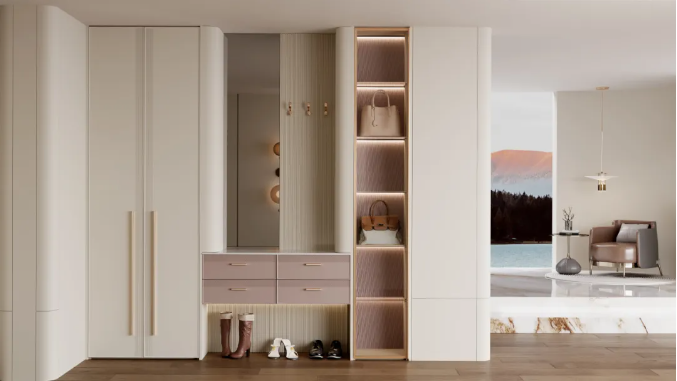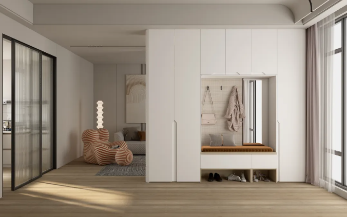 入户即享仪式感!一体式鞋柜底部悬空放常穿鞋,中部镜面设计扩容视觉,顶部吊柜隐藏换季杂物,护墙板直通吊顶,归家第一眼就惊艳。