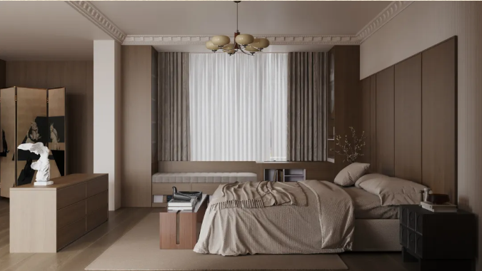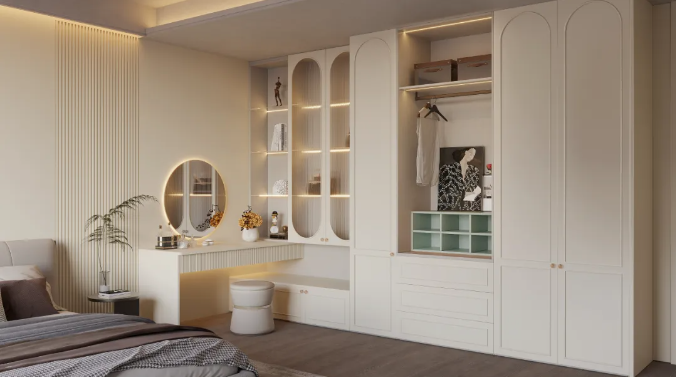 小户型救星:卧室+梳妆台+衣柜三体联动,梳妆台与柜门错位设计,化妆休息互不干扰。