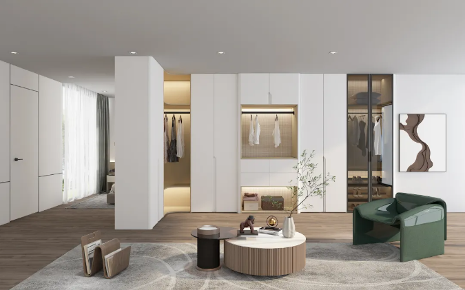 悦己悦生活:玻璃展柜,一目了然,打造每日出门的专属秀场;45°斜口磁吸静音门,隔绝纷扰,构筑静谧休憩的私享静音舱。顶天立地衣柜,奢藏井然有序。