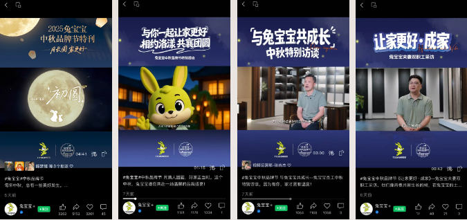 兔宝宝借中秋品牌节重塑用户关系,实现从单向传播到双向共建的转变。首届”中秋寻兔”活动以趣味互动唤醒大众对传统节俗的热情,建立起超越交易的情感纽带,不断强化“家”的价值内核。中秋品牌节系列情感短片,聚焦孩子成长、婚房布置、陪伴父母等真实场景,引发用户情感共鸣;定制化中秋互动巧妙融合文化元素与品牌符号,深化消费者对“兔宝宝”的认知;晚会中少数民族员工与远方亲人的真情告白,更触动无数人心。以品牌节为载体,兔宝宝实现了从“情感触达”到“心智占领”的跨越,构建起与用户共创共生的长期关系。