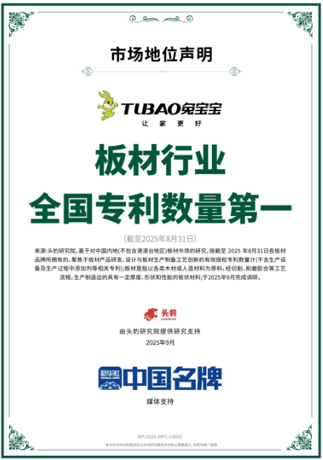 在创新驱动发展的时代浪潮中,知识产权已成为衡量企业核心竞争力的关键标尺。近日,兔宝宝荣获“板材行业全国专利数量第一”市场地位声明,这充分彰显了公司雄厚的科技底蕴与领先的创新活力。