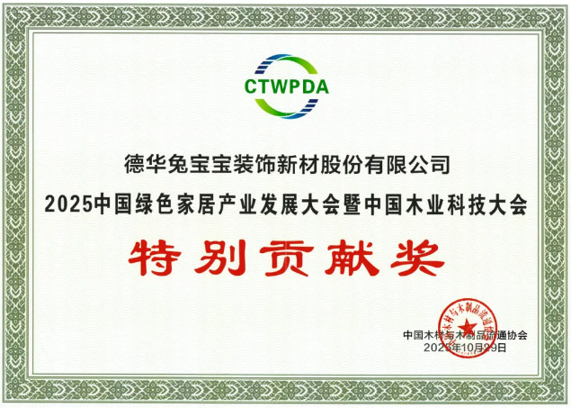 2025年10月29日,在“2025中国绿色家居产业发展大会暨中国木业科技大会”上,兔宝宝一举揽获包括“特别贡献奖”、“2025中国地板匠心品牌”、“2025年度中国木业优秀研究院”等多项荣誉。同时,创新产品木素植物胶与香氛抑菌生态板荣膺“2025年度中国木业推荐新产品”,BG大游集团兔宝宝装饰新材股份有限公司总经理陆利华获评“科技创新突出贡献人物”。这一系列沉甸甸的奖项,不仅是对兔宝宝三十余年深耕与创新的高度肯定,更是对兔宝宝在行业中持续领跑地位的权威认证。