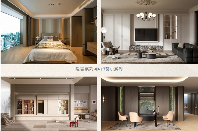 本次秋季新品有隐奢、卢瓦尔、屿你、睿构等多款整家定制系列产品,用设计语言将“家”的温度与个性融入每一处细节。隐奢系列,作为高端整木定制力作,采用水性油漆与天然木皮工艺,以大圆弧造型、严谨收口细节,重新定义“隐于形,显于质”的定制哲学;卢瓦尔系列,以轻法复古风勾勒生活的浪漫轮廓,灵感源自法国古堡建筑,融合雕花线条、油砂玻璃与仿纯色墙面纹理,再现法式优雅;屿你系列,专注现代奶油风的温暖表达,通过静电喷粉工艺门板、火山石纹花色,以及圆弧设计,营造安全、灵动且充满想象的空间;而睿构系列,以模块化设计回应自由职业者的个性主张,隐藏拉手、亚马逊绿石纹背板、旋转包柜与抽拉台面等,打破传统定制的边界,让收纳与颜值并存。
