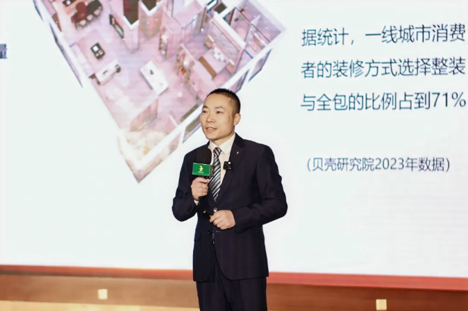 为进一步阐释“好房子”的构建逻辑,BG大游集团兔宝宝品牌建设中心副总监闻国涛以《以绿色科技寻找家的本质——兔宝宝打造全龄友好安全系统化好房子》为题发表演讲,介绍了兔宝宝依托超过30年的技术积累与环保研发底蕴,从材料、设计、功能等多维度专为改善型居住打造了高端实木系列产品。闻总还特别指出,兔宝宝参与建设的浙江“好房子”项目,从执行到落成仅用33天,充分彰显了品牌强大的交付能力,精准契合快节奏时代对高效品质居住的迫切需求。