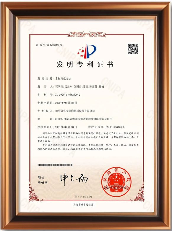 兔宝宝研发出了一种木材染色方法,不仅显著减少了天然木材的使用,降低了对环境的压力,而且通过精湛的染色技术,让木材在保留天然纹理和质感的同时,焕发出丰富多彩的视觉装饰效果。这一创新专利的推出,无疑为年轻一代消费者提供了更多个性化的选择,满足了他们对于家居环境的独特审美需求。