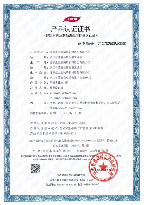 近日,兔宝宝难燃胶合板获得由应急管理部四川消防研究所颁发的行业首张“建筑材料及制品燃烧性能分级认证”难燃B1级证书。该认证严格遵循SCFRI-CP-JC001-2025实施规则与GB 8624-2012国家标准,标志着该产品继中国绿色产品认证后,再添一项权威安全背书,进一步彰显了公司在燃烧安全性能方面的卓越实力。