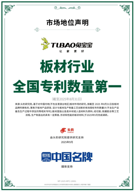 多年来,兔宝宝凭借在木业领域深厚的技术积累和卓越的创新能力,积极参与国际、国家和行业标准的制定工作,成为行业标准的重要推动者和引领者。截至目前,兔宝宝已参与制定ISO国际标准12项,参与定制国家标准138项,参与定制行业标准114项,并申请674项专利,稳居行业专利数量首位。这些数字既是兔宝宝科研实力的有力证明,更是引领行业发展的坚实支撑。