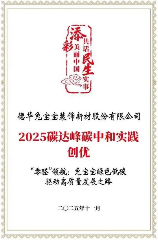 “2025 绿色低碳赋能高质量发展创优”奖项,是对兔宝宝深耕环保板材领域、持续引领健康标准的高度认可。作为装饰材料行业的标杆企业,兔宝宝始终将 “绿色、健康、环保” 为产品理念,用三十余年技术迭代完成了从“达标”到“定义标准”的转变。