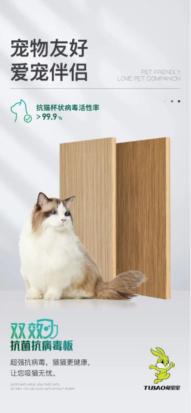 对于养宠家庭而言,环境中还可能存在影响宠物健康的病原体。例如,猫杯状病毒是猫科动物中常见且传染性较强的病原,对宠物健康构成不小威胁。兔宝宝双效抗菌抗病毒板材对猫杯状病毒同样表现出显著的抑制效果,灭活率超过99.9%。这一特性使得它在守护人类健康的同时,也能为家中的宠物伴侣提供多一层保护,特别适合有宠物的现代家庭。