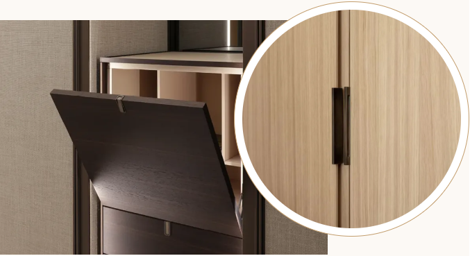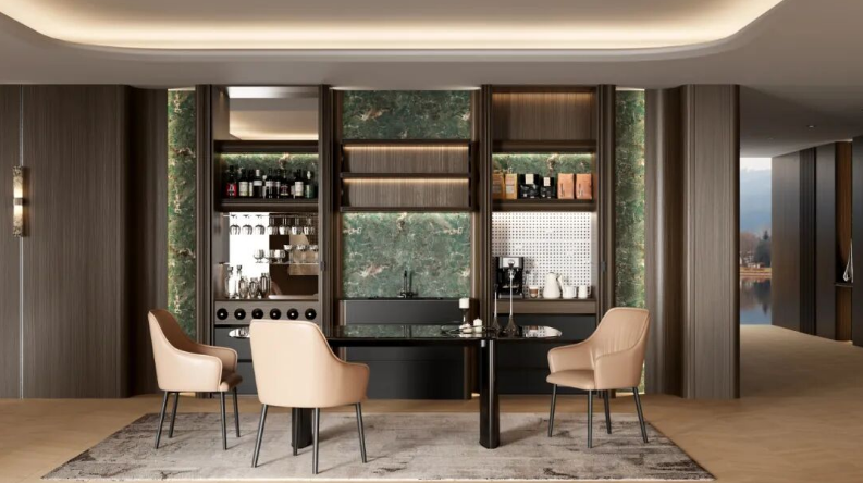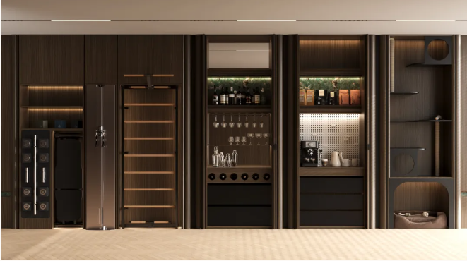 餐边柜采用一字型布局,结合开放区域水槽柜,满足日常用餐与轻食制作需求。咖啡柜与酒柜作为独立的功能模块,可依据需求灵活配置于玄关、客厅或餐厨等不同空间,实现风格统一与功能自由。水吧区内置抽拉台面,使用时与桌面齐平,有效拓展操作空间,巧妙解决小户型台面不足的痛点。