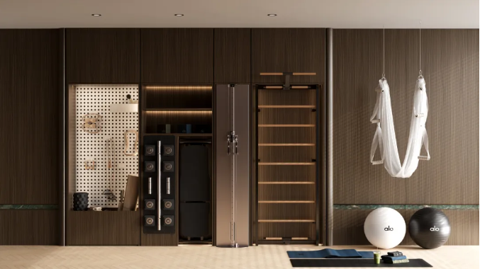 采用900mm宽标准模块柜,灵活适配多种户型与功能需求。嵌入式健身器材设计使空间整体感更强,兼顾美观与实用。可根据实际健身需求定制功能模块,对不同类型的健身器材进行专属定制收纳设计,解决居家健身器材存放杂乱、取用不便的痛点,让运动融入日常,塑造健康生活秩序。