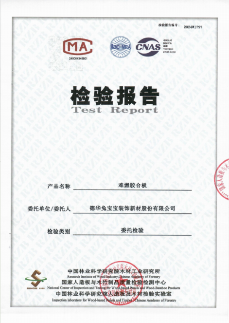 从检验结果可以看出,兔宝宝难燃胶合板五项指标均达到标准,其中“600s内总热释放量”和“燃烧增长速率指数”是衡量难燃胶合板燃烧性能的重要指标,其低数值反映了兔宝宝难燃胶合板在火灾中释放热量小和不易燃烧,大大降低了火灾的危险性和破坏力,并且燃烧性能达到了GB 8624-2012标准中的B1级。