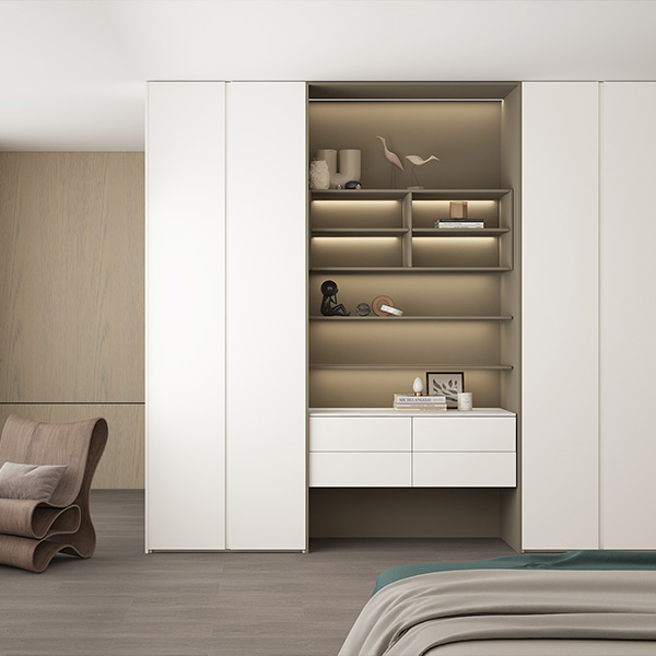 卧室采用一字型布局的设计, 集展示、储存、收纳于一体。