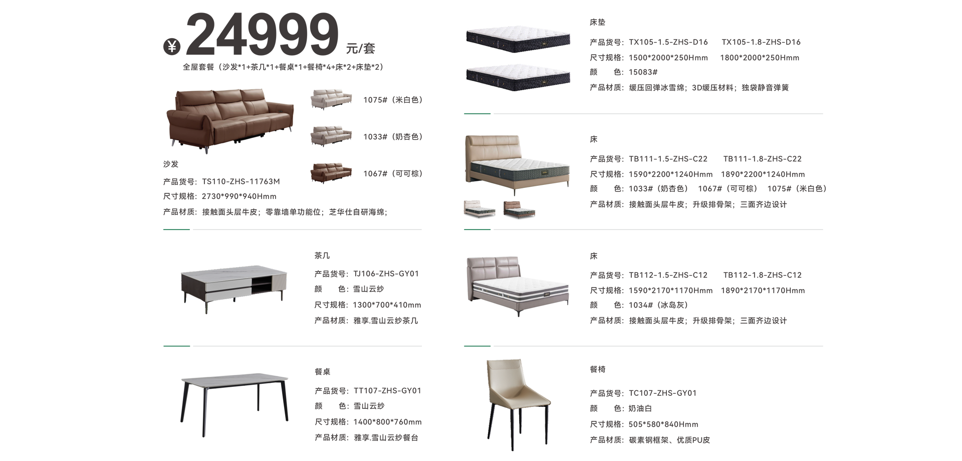 沙发*1+茶几*1+餐桌*1+餐椅*4+床*2+床垫*2